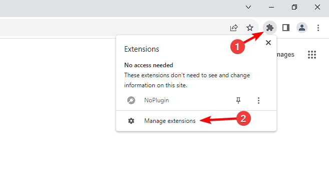 - Once installed, click the Extensions icon and choose Manage extensions.