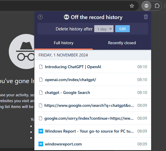 - Now start a private browsing session and youโll be able to access your history via the extension icon.