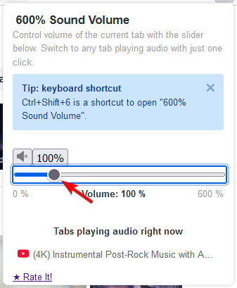 You can also use Ctrl + Shift + 6 to quickly open the extension and then use keys 0 to 6 to quickly adjust the volume. You can also use the arrow keys to fine-tune the volume.