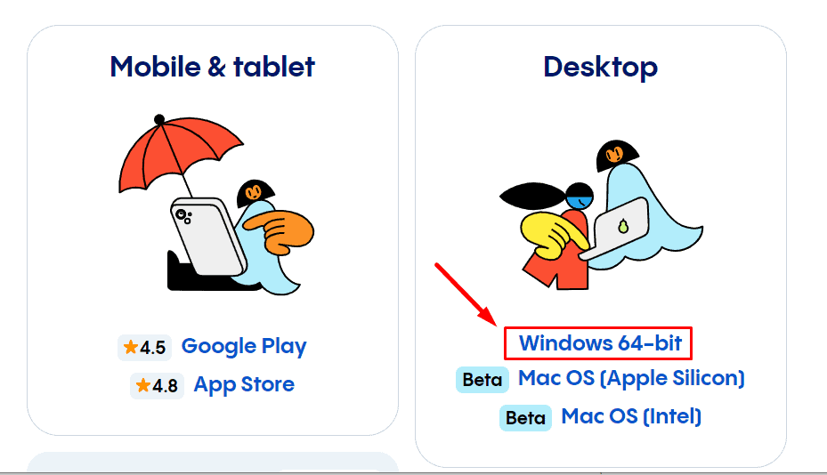 - Identify your device (Mobile & tablet or desktop), tap on your operating system, and the downloads will start automatically.
