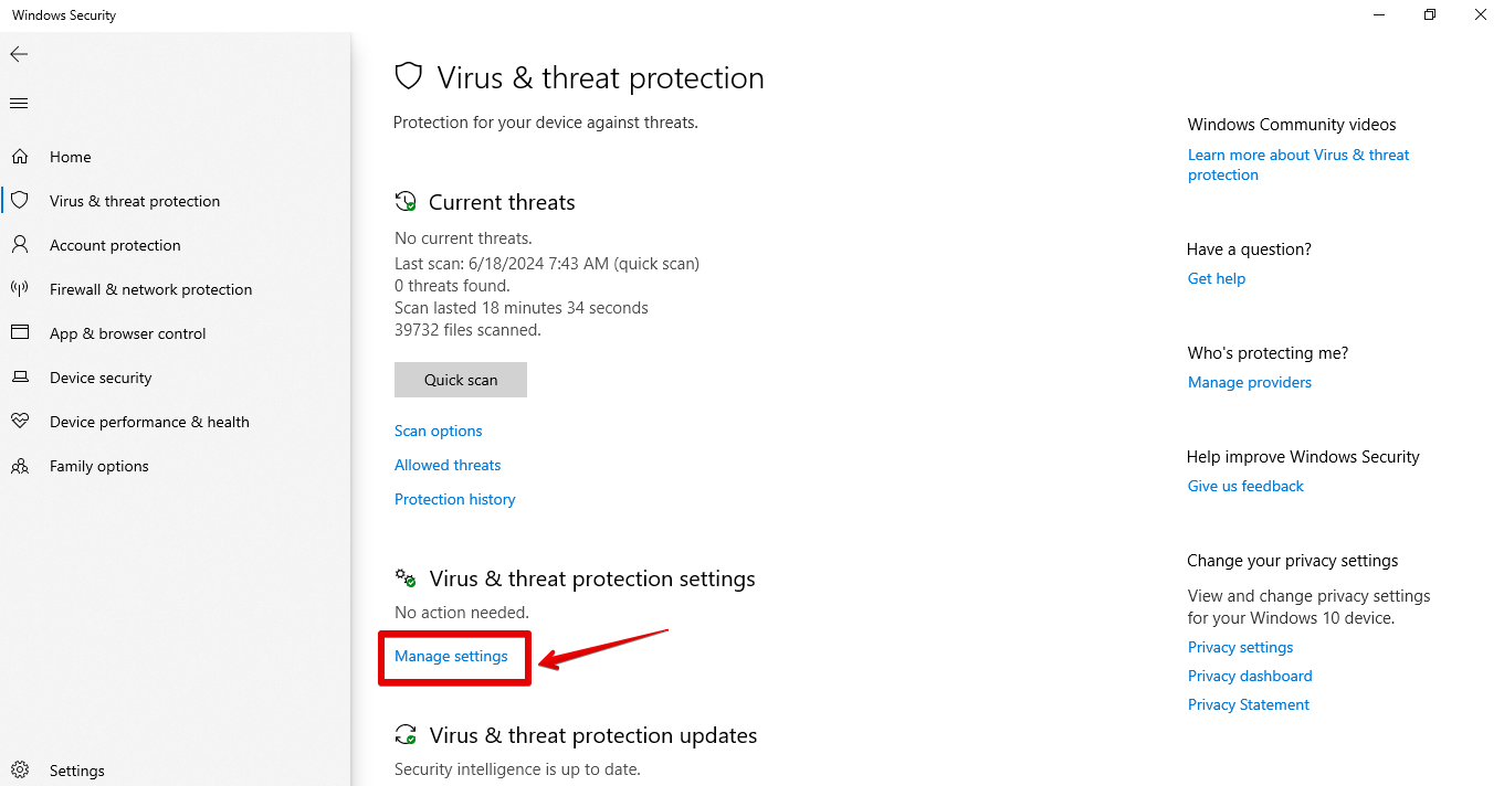 - Click on “Manage settings” under the “Virus & threat protection” section.