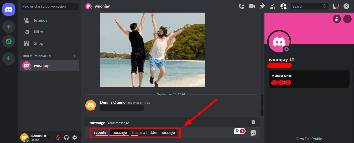 - Go to the message field and type “/spoiler,” hit the space button, then add the message you want to hide.