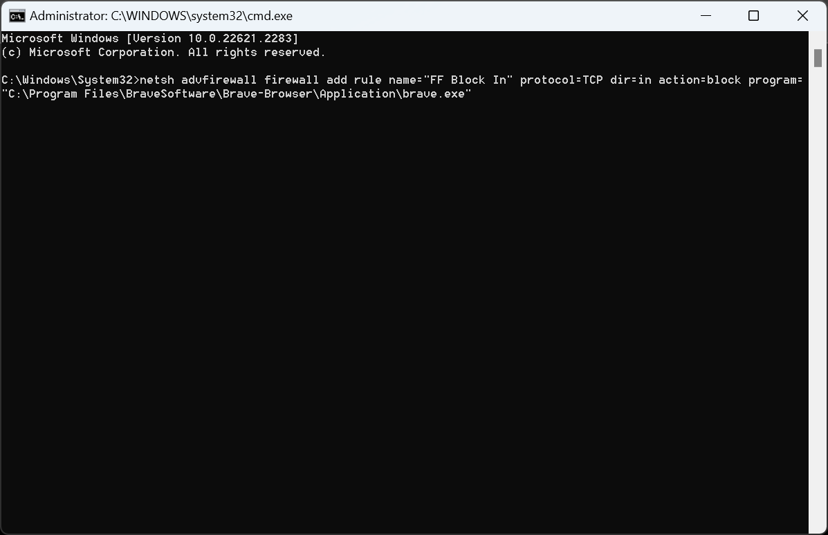 netsh advfirewall firewall add rule name="FF Block In" protocol=TCP dir=in action=block program="C:\Program Files\BraveSoftware\Brave-Browser\Application\brave.exe" - Similarly, execute the following two commands and replace Path with the actual program path as found in the File Explorer: