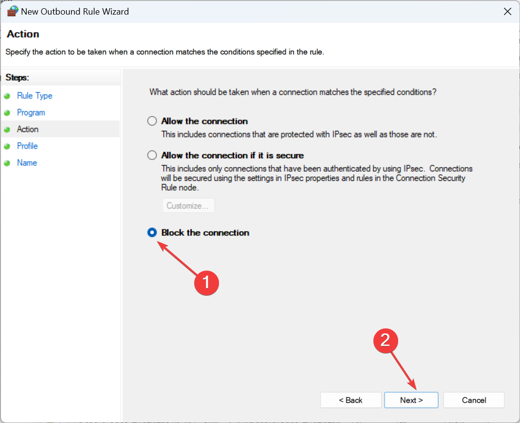 - Select Block the connection radio button and click Next.