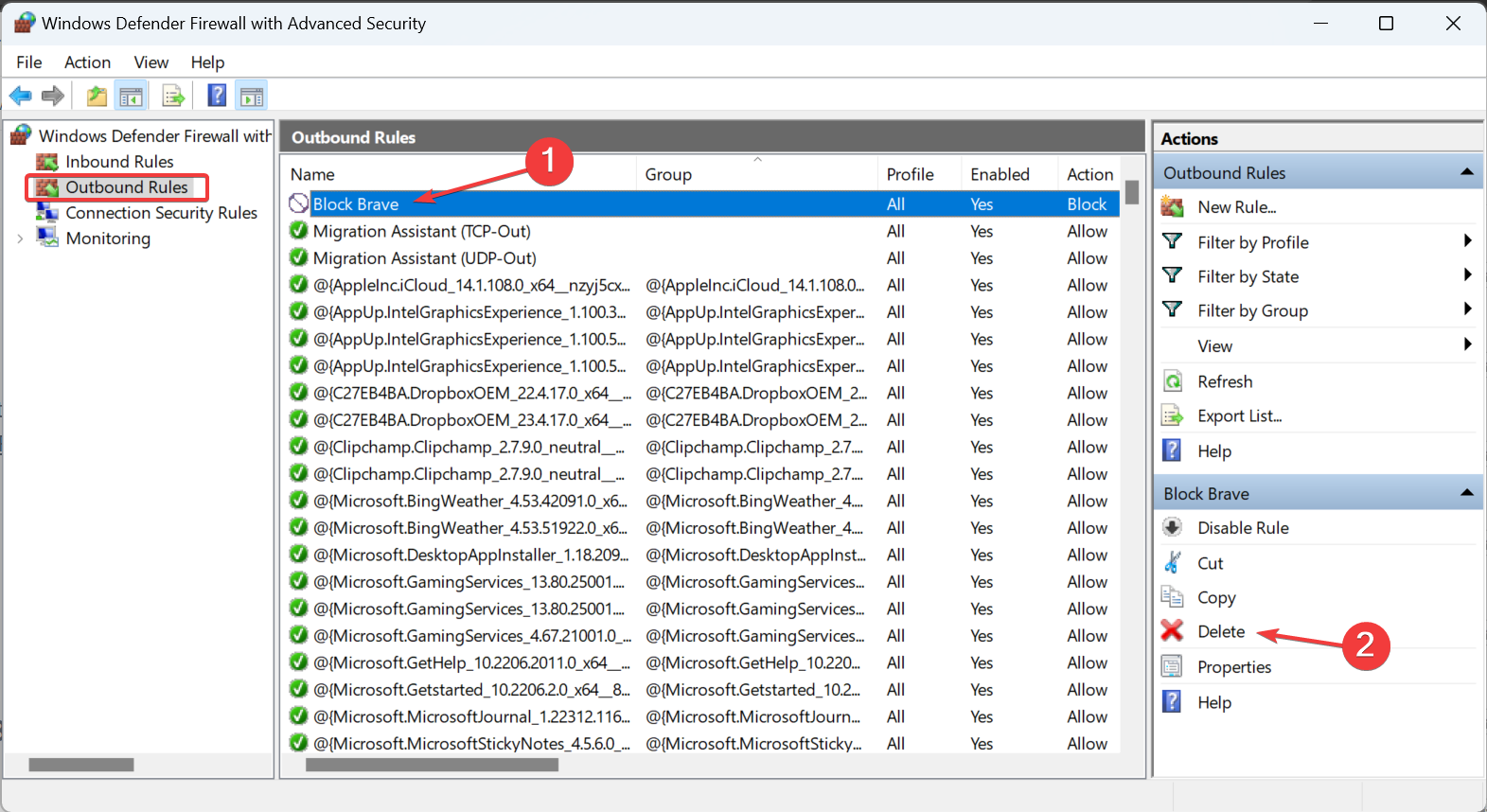 Delete the rule: Open Windows Defender Firewall > select Advanced settings from the left panel, go to Outbound Rules > right-click the relevant rule > select Delete > click Yes in the confirmation prompt.