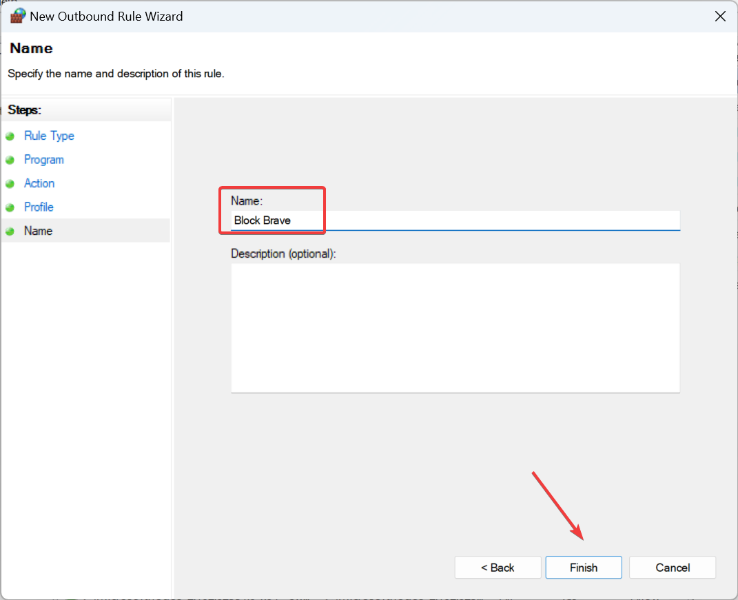 - Enter a name and description (optional) for the rule, and then click Finish.