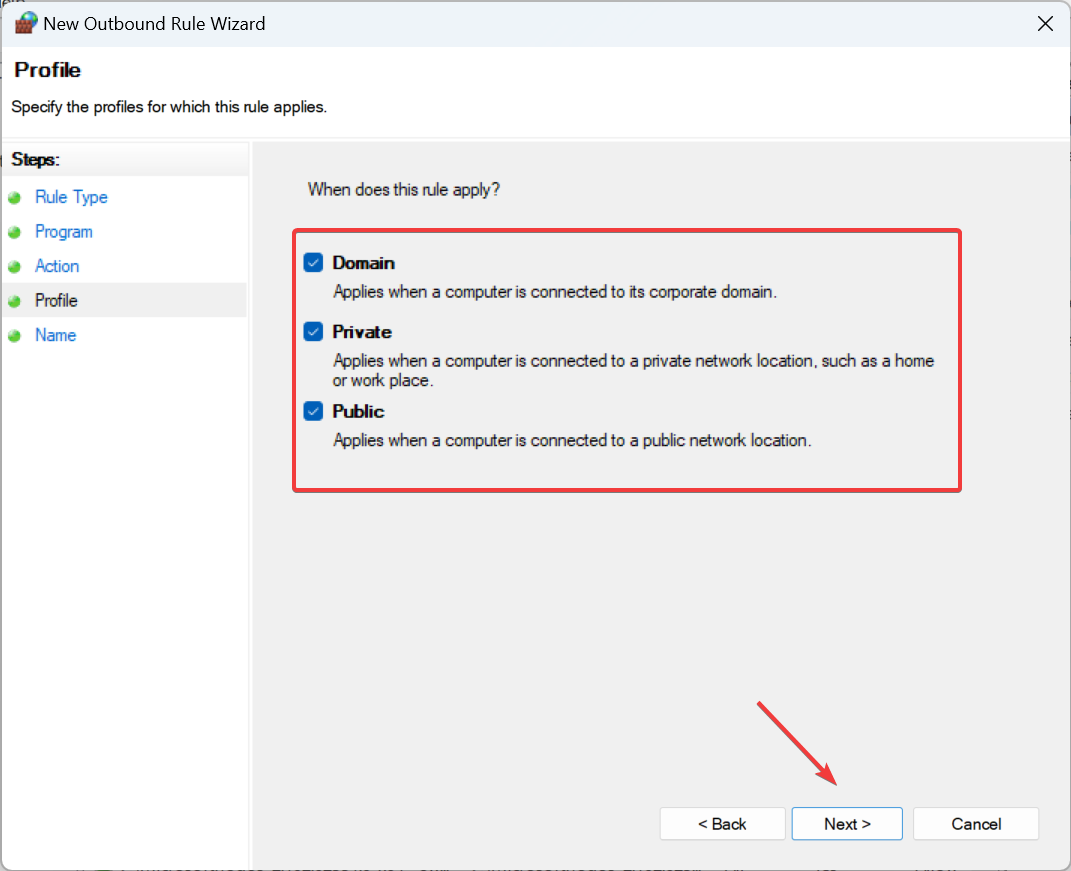 - Tick the checkboxes for all three network profiles and click Next.