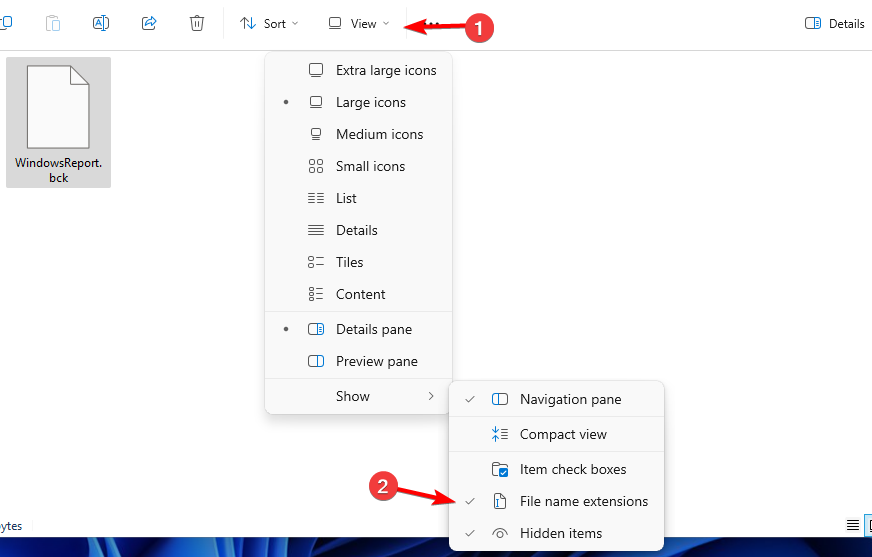 - Open File Explorer, click View and check File name extensions.