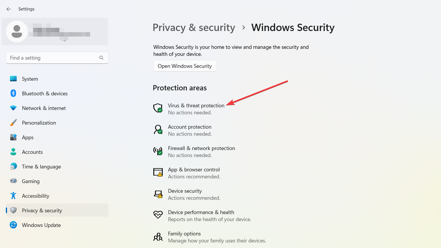 - Click Open Windows Security and look for any issues reported under Virus & threat protection.