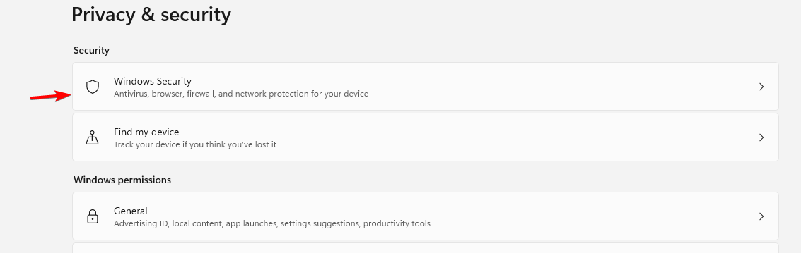 - Press Windows key + I to open Settings, then go to Privacy & security and select Windows Security.