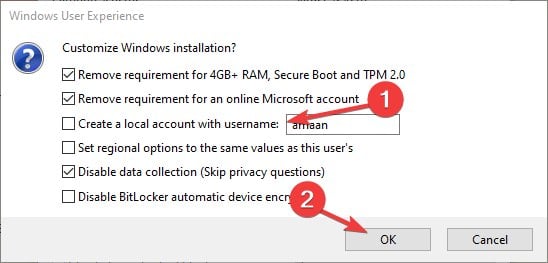 - Untick Create a local account with username and then click OK in the prompt. The Windows 11 installation media will created in a few minutes.