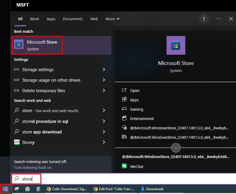 - Click on the Start menu button and type Store.