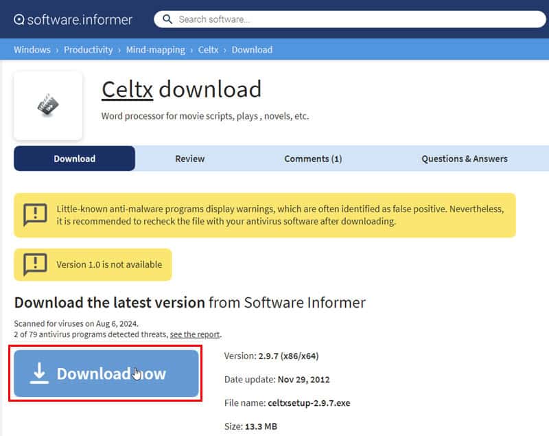 So let’s say, you want to download the tool from Software Informer. Click on the above link and you’ll see its Celtx free download for Windows 10 page. Click on the Download now button.