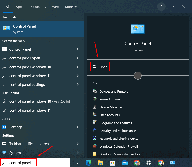 - Tap the search button beside the Windows icon, type Control Panel, and tap open.