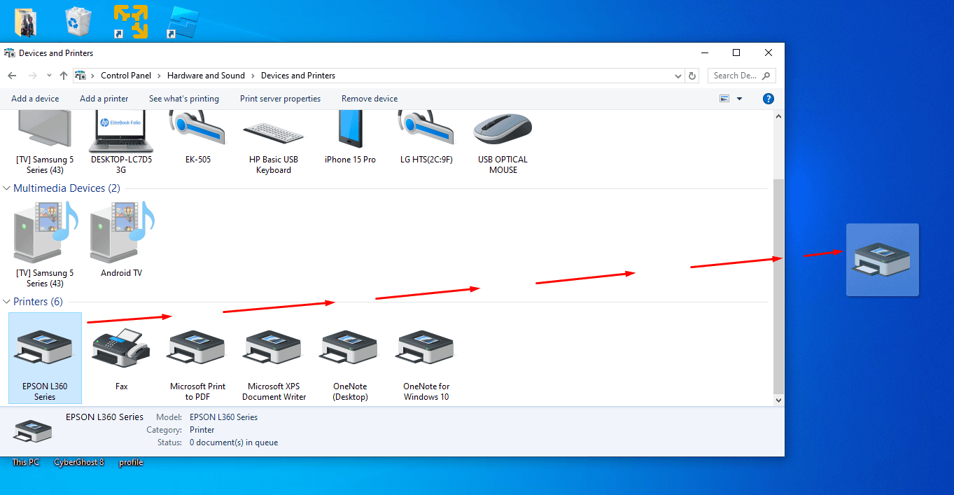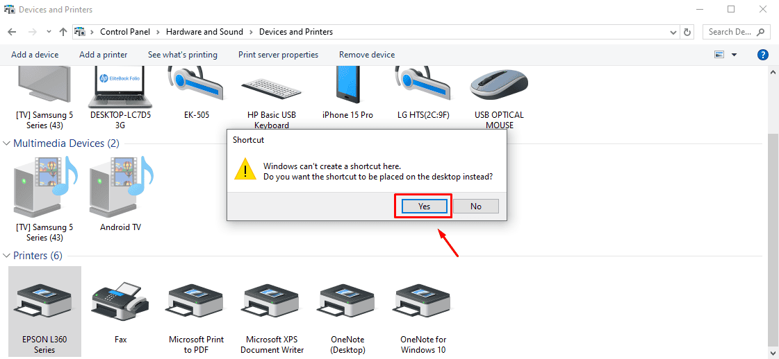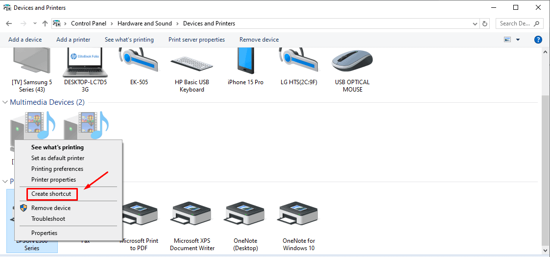 - Identify the printer to which you want to add a shortcut, right-click on it, and then select Create Shortcut. I’ll do this for my EPSON L360 printer.