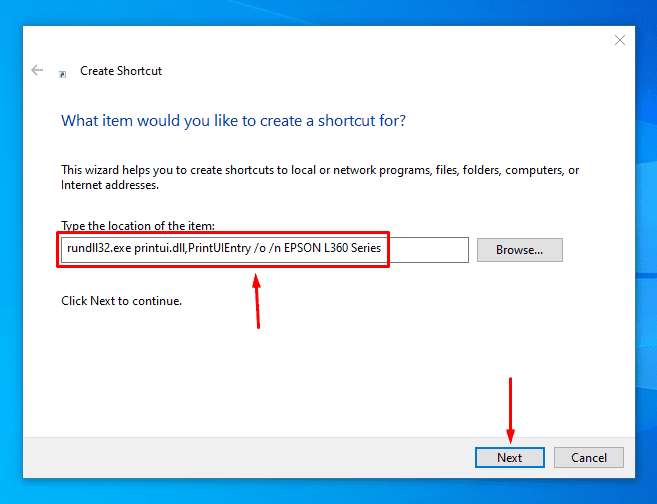 - Type rundll32.exe printui.dll,PrintUIEntry /o /n “printer_name” in the location field. Replace “printer_name” with your device’s name, then hit Next.