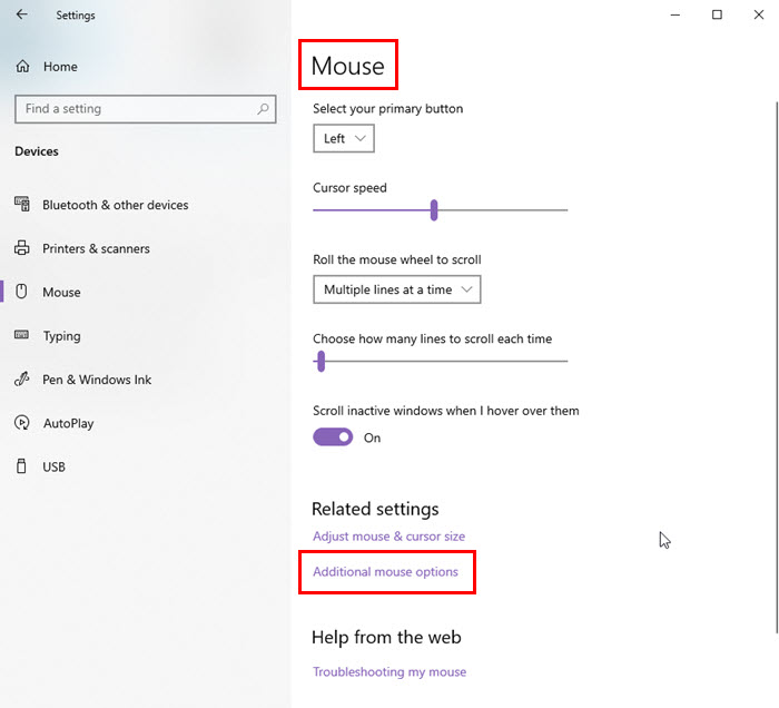 - Click on the Additional mouse options hyperlink below the Related settings section.