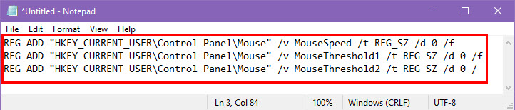 REG ADD "HKEY_CURRENT_USER\Control Panel\Mouse" /v MouseSpeed /t REG_SZ /d 0 /f