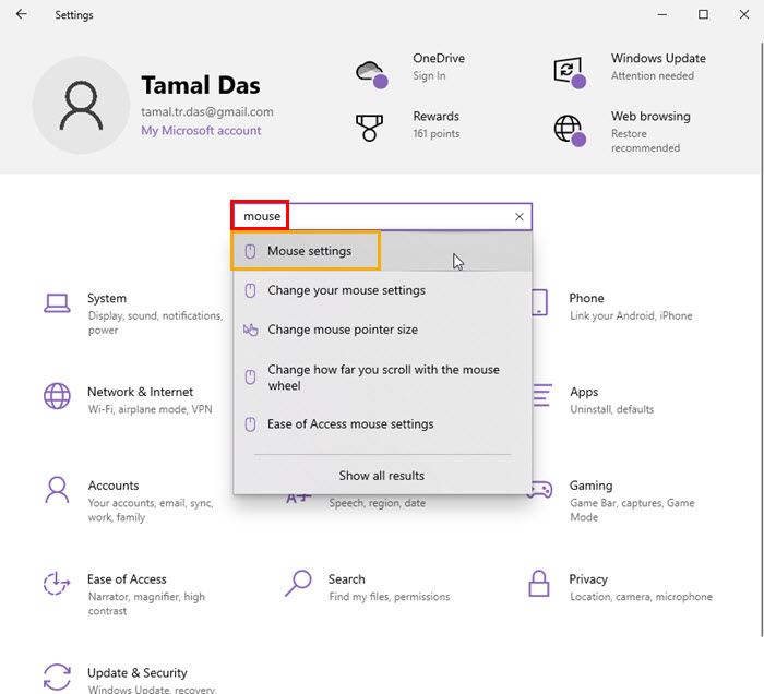 - Type Mouse in the Find a setting search field and click on the Mouse settings option.