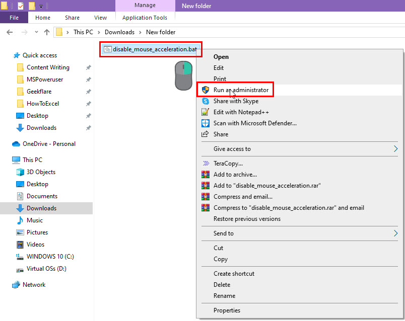 - Right-click on the batch file and choose Run as administrator to disable mouse acceleration.