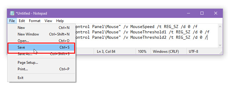 REG ADD "HKEY_CURRENT_USER\Control Panel\Mouse" /v MouseThreshold1 /t REG_SZ /d 0 /f