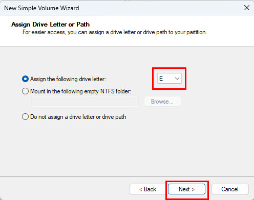 - Click Next to choose the auto-selected drive letter.