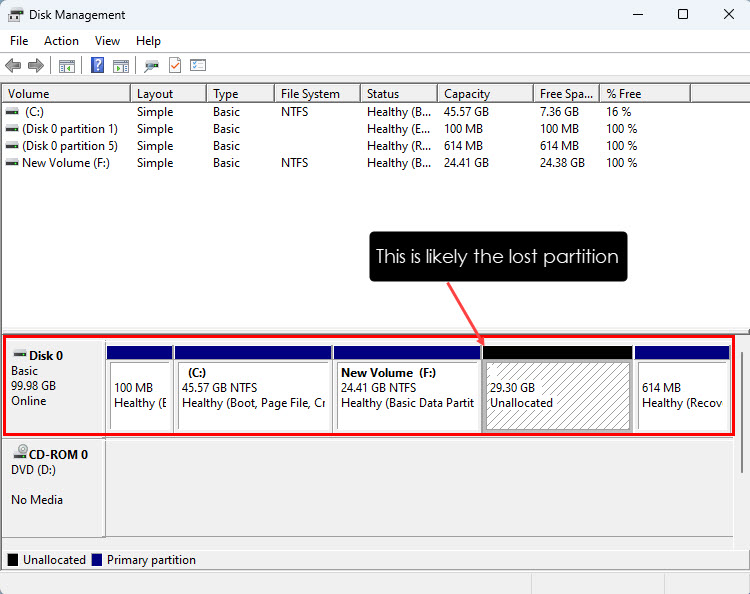 - However, if there was an existing Unallocated disk space, the recently lost partition would be merged with that one.