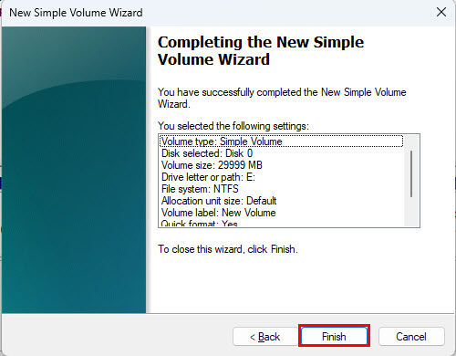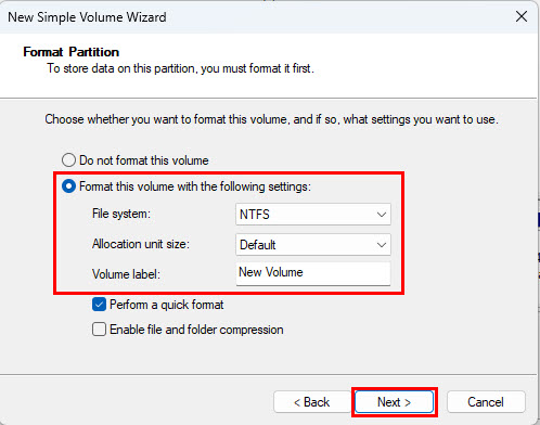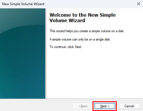 - The New Simple Volume Wizard will pop open. Click Next.
