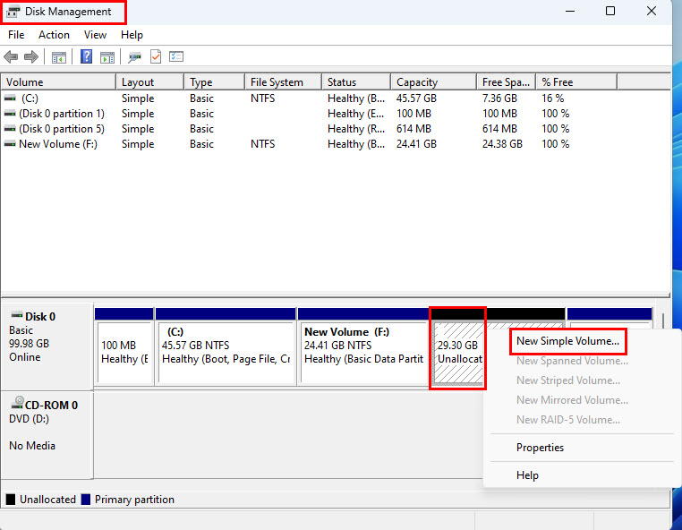 - Then, click on the Unallocated box, right-click, and choose the New Simple Volume option.
