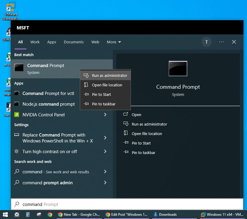 - Open the Windows 10 terminal by searching for Command Prompt in the Start Menu, then right-click on it and select the Run as administrator option.