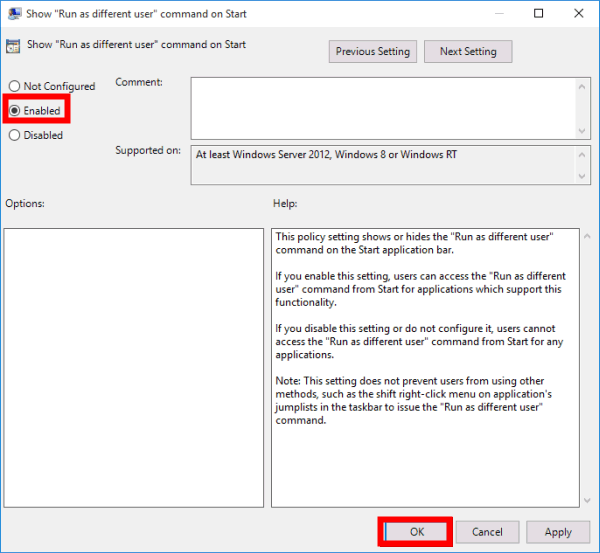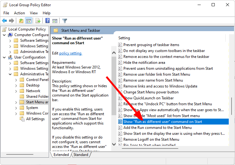 User Configuration/Administrative Templates/Start Menu and Taskbar - Double-click on Show “Run as different user” command on Start.