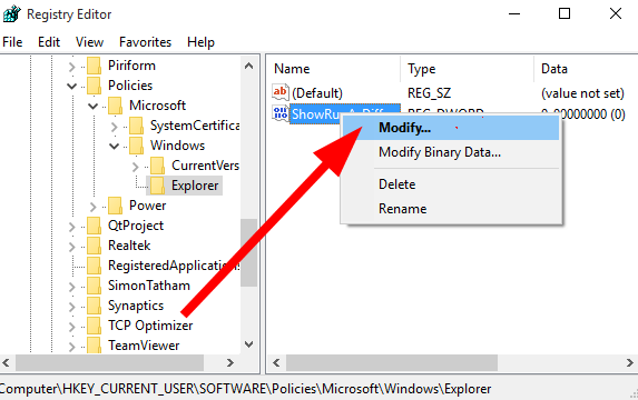Computer\HKEY_CURRENT_USER\Software\Policies\Microsoft\Windows\Explorer - Right-click on the ShowRunAsDifferentUserInStart key and select Modify.