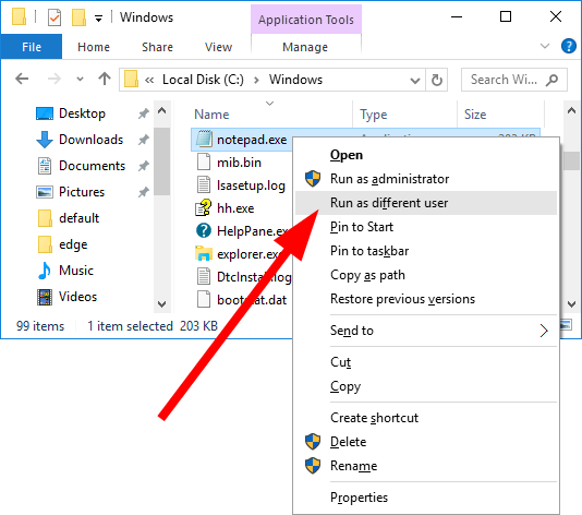 - Select Run as a different user from the context menu.