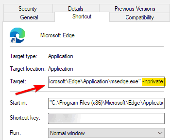 - In the Target field, add space and enter -inprivate after quotes.